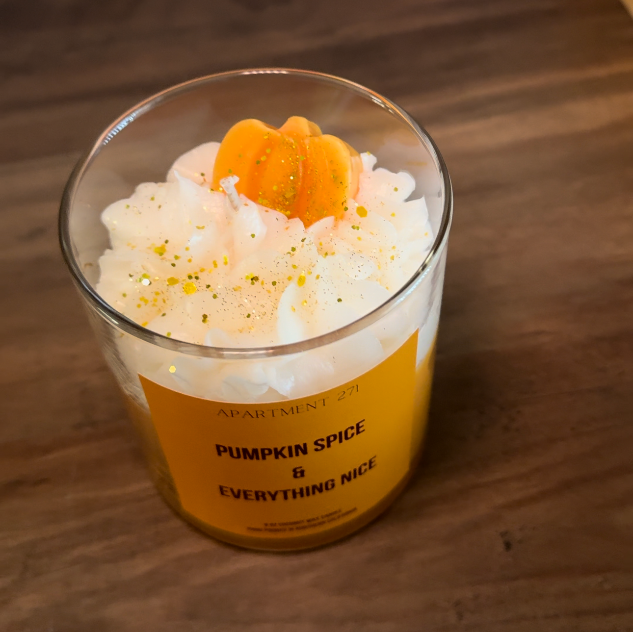 THE Pumpkin Spice candle! A cozy blend of autumn's finest aromas. Imagine the warm, comforting scent of spiced pumpkin pie fresh out of the oven, mingled with rich, creamy buttercream frosting. Notes of cinnamon, nutmeg, and a hint of vanilla create a perfect balance of sweetness and spice, filling your space with the essence of fall. Whether you're unwinding after a long day or setting the mood for a cozy evening, this candle will wrap you in the familiar, heartwarming scent of the season. Ideal for gifting and treating yourself!